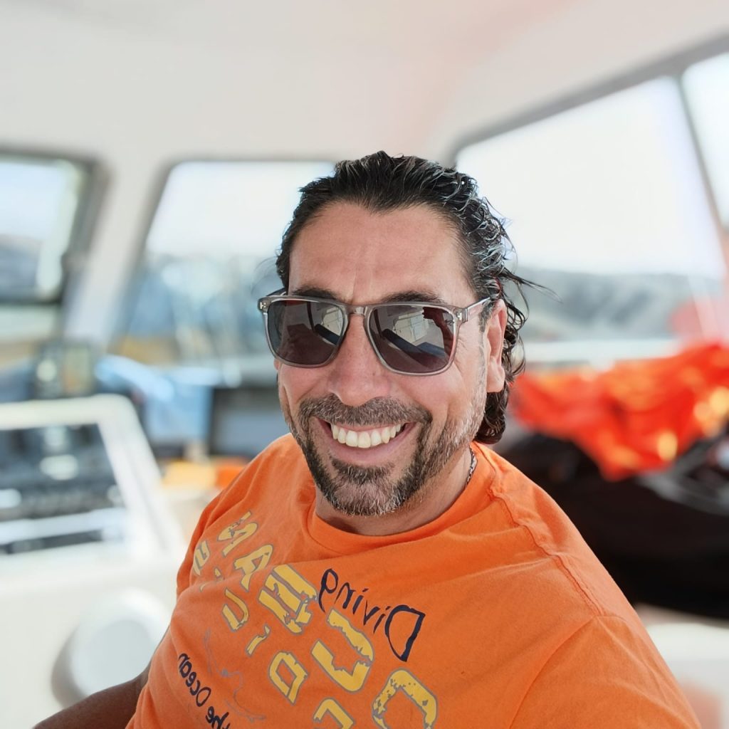 Patrón Profesional, PADI MSDT Platinum y Ex-buceador de la Armada. Tras pilotar en todo tipo de competiciones de coches, cambió el volante por el timón. El mejor conocedor de los vientos y mareas de todo el litoral gaditano.